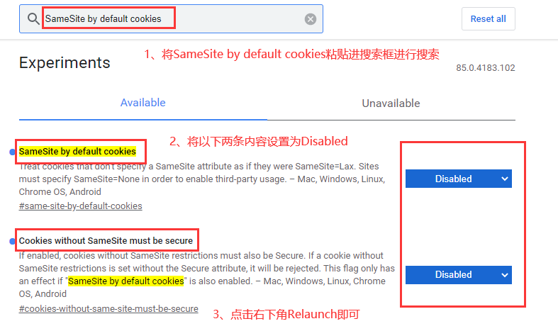 2、设置SameSite by default cookies和Cookies without SameSite must be secure这两个属性为Disabled